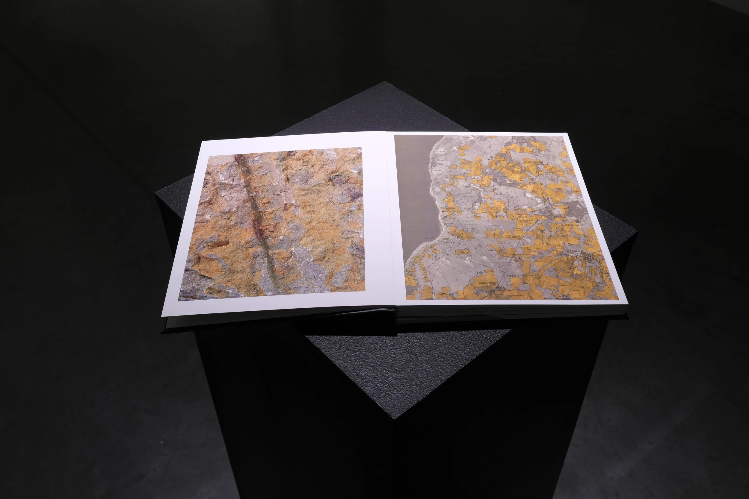 Photo: Photo book including both documentation of the area and of fossils in limestone collected from the site, as well as arranged portraits of my children building cairns with the stones