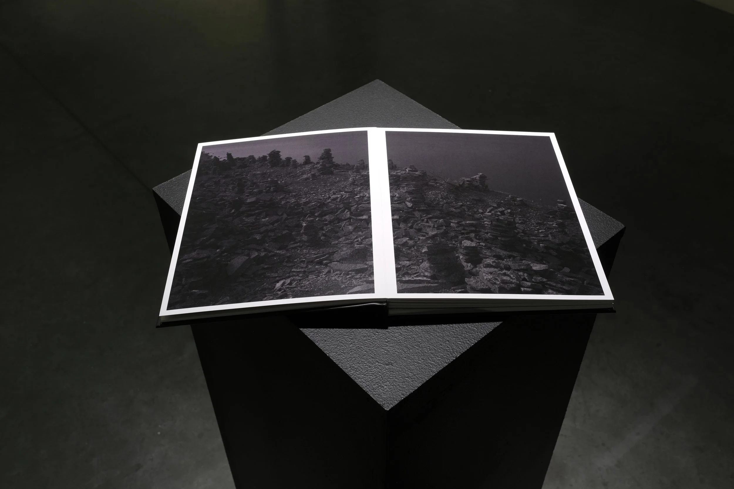 The source material for the soundscapes is derived from a combination of field recordings and vocal recordings of my children. The field recordings were captured at the site where the original stones were collected and where the accompanying video was filmed. These recordings were pitch-shifted and time-stretched to evoke a more dreamlike and ethereal atmosphere. The voices of my children were digitally processed, fragmented, and mapped onto a keyboard, enabling me to compose intuitive melodies that emerged spontaneously. By incorporating my children’s voices in this manner, their presence is rendered tangible within the gallery space, extending beyond the confines of the photo book. In the video above, only one of the audio loops can be heard.